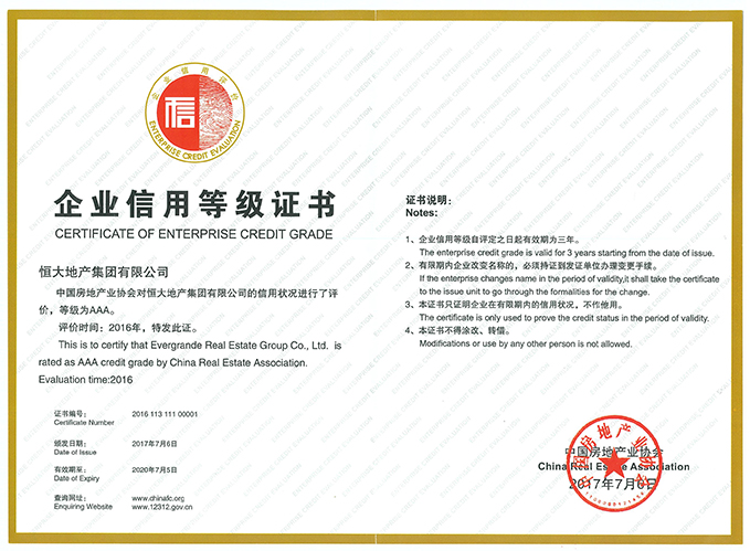 7月11日,中国房地产业协会公布了2017年信用等级A级以上的房企榜单,恒大地产集团有限公司获最高等级AAA。